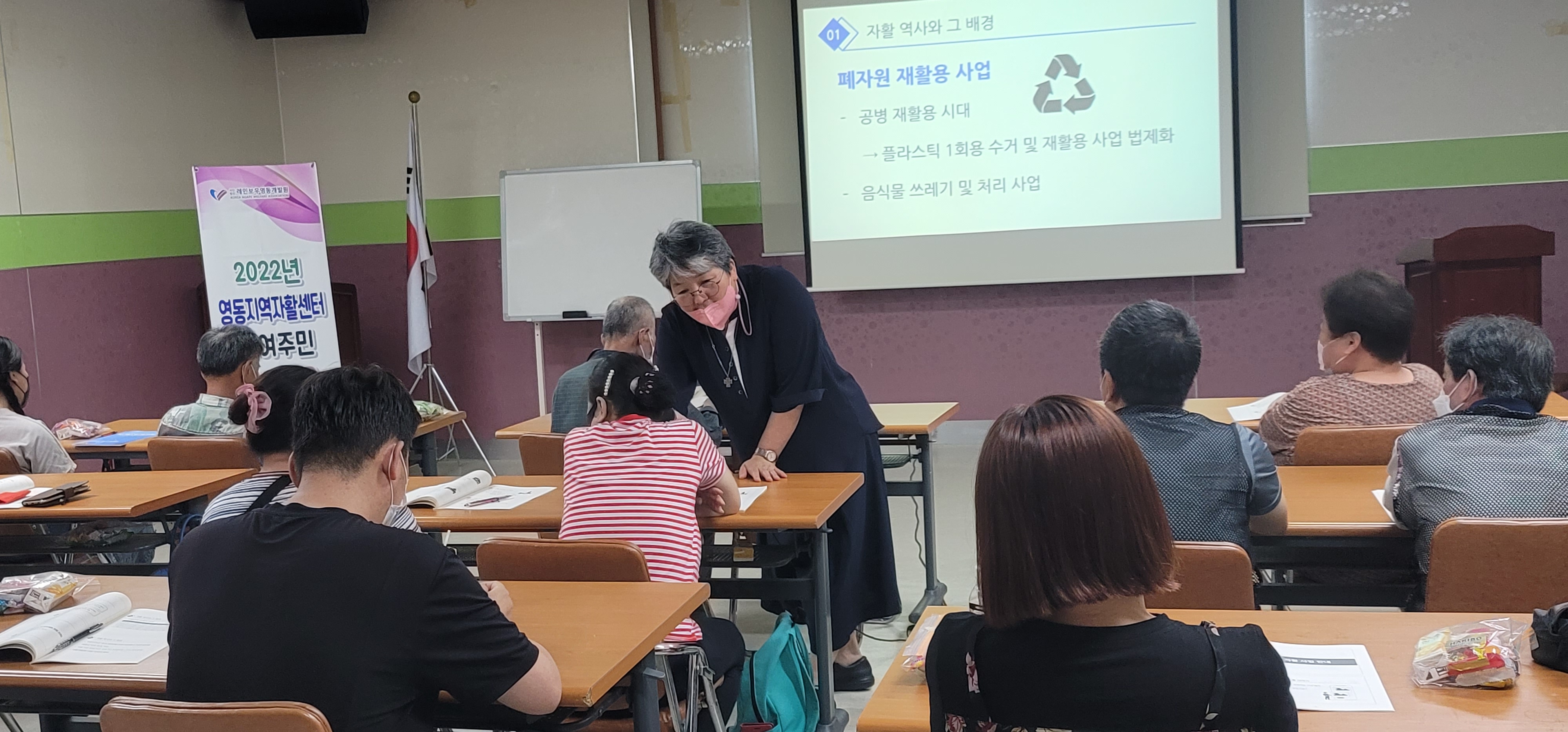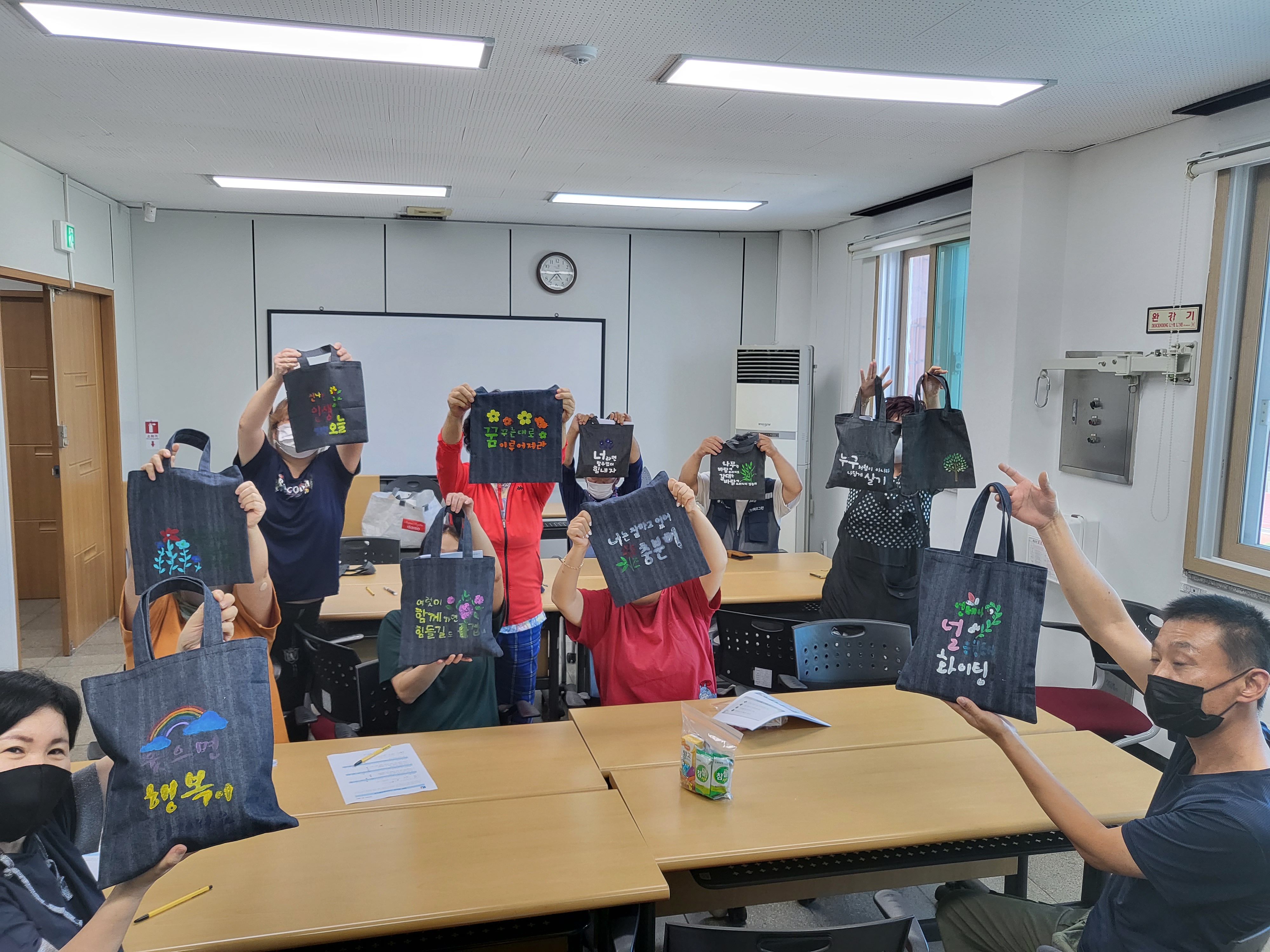 9기 증평자활과 11기 충주자활은 이선재 센터장이 진행하는 30여명이 소양교육에 참여하여, 근로에 대한 의미를 배우고 에코백 체험을 통한 공동체 의식을 배양하는 뜻깊은 시간을 가졌다.