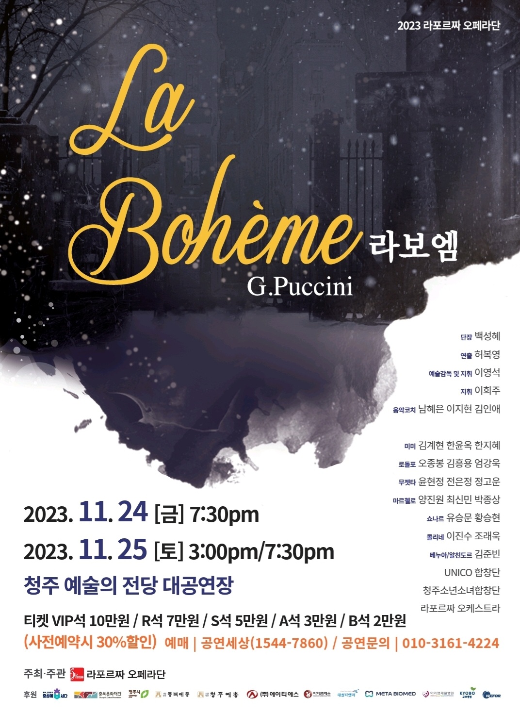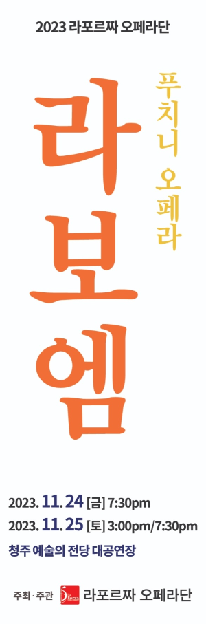 라포르짜오페라단(상임지휘자 : 이영석)이 오는 11월 24~25일 청주예술의전당 대공연장에서 푸치니의 '라보엠(La Boheme)'를 선보인다.