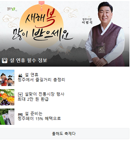 청주시민 여러분, 그리고 고향을 찾으신 귀성객 여러분 모두 가족과 함께 따뜻하고 평안한 설 명절 보내시길 바랍니다.