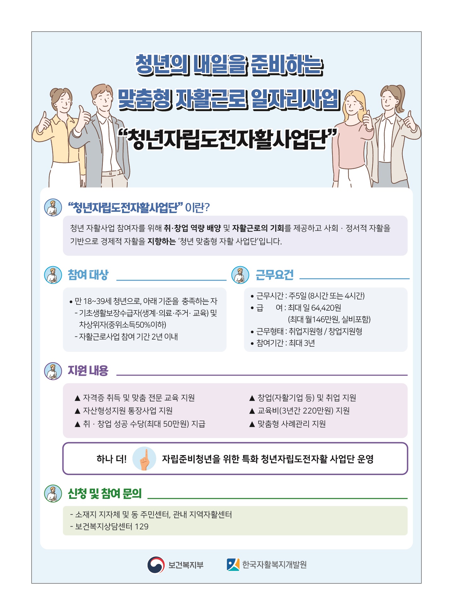 이 지원되며 특히 이번에는 자립을 위한 특화 쳥년자립도전자활사업단을 운영한다.